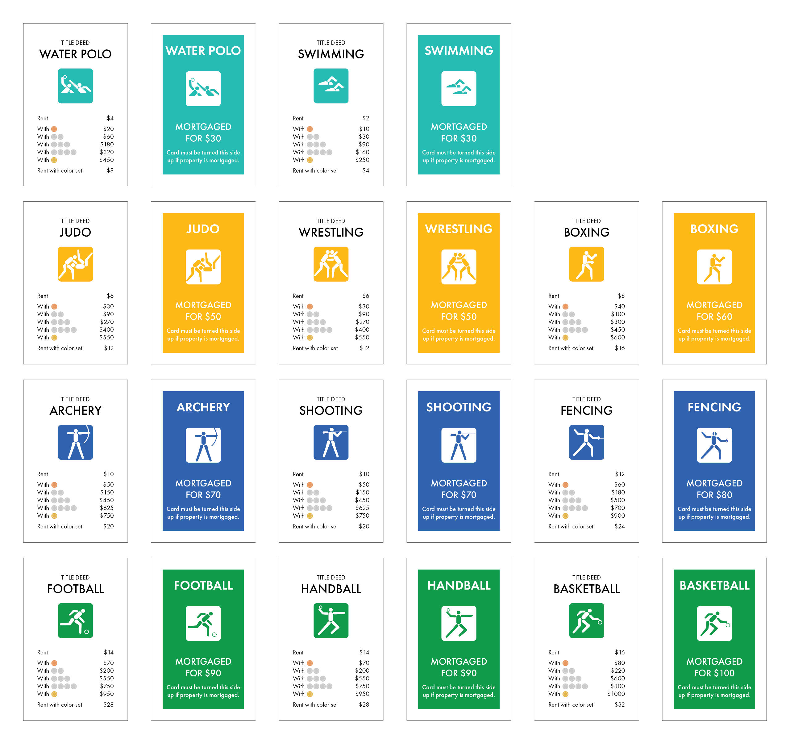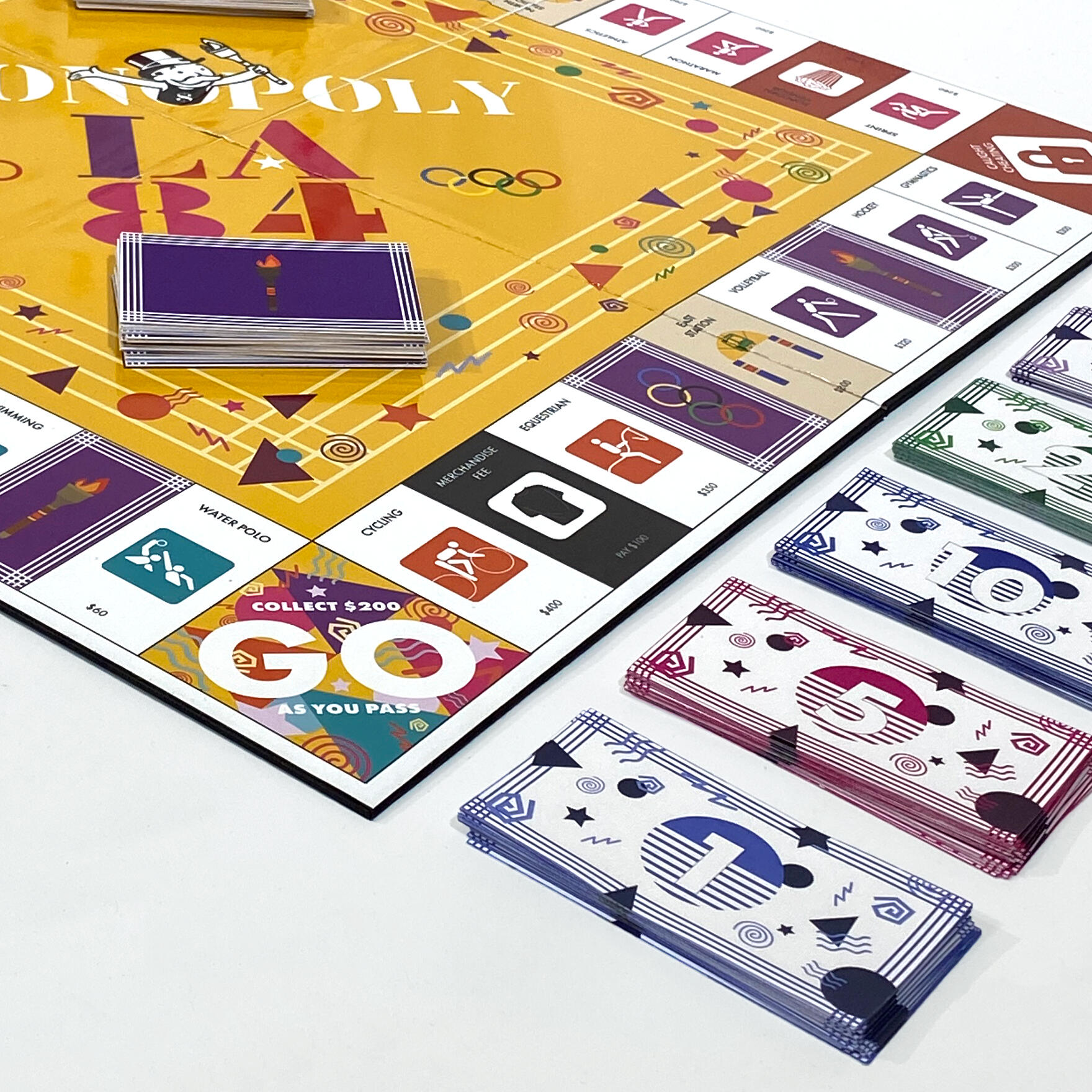 Overview: There are hundreds of themed Monopoly boards in the world. Students were tasked with working with a team to design one such board based on a specific design movement—in this case, Olympic Design.Brief: Alongside two other designers (Thien Pham and Sarah Wert), create a Monopoly board themed around Olympic Design. Fully design the board center, property spaces and cards, corner spaces, chance and community chest spaces and cards, money, and all other game assets together as a team. Delegate responsibilities among one another.Solution: By focusing on the LA '84 Summer Olympics, literal Olympic design was implemented into the gameboard and its pieces. In particular, I was tasked with designing the corner spaces, money, chance and community chest cards, and utility cards. On top of that, I took it upon myself to organize the final board, the final presentation images, and go over each piece created by my group members to ensure every element was consistent.