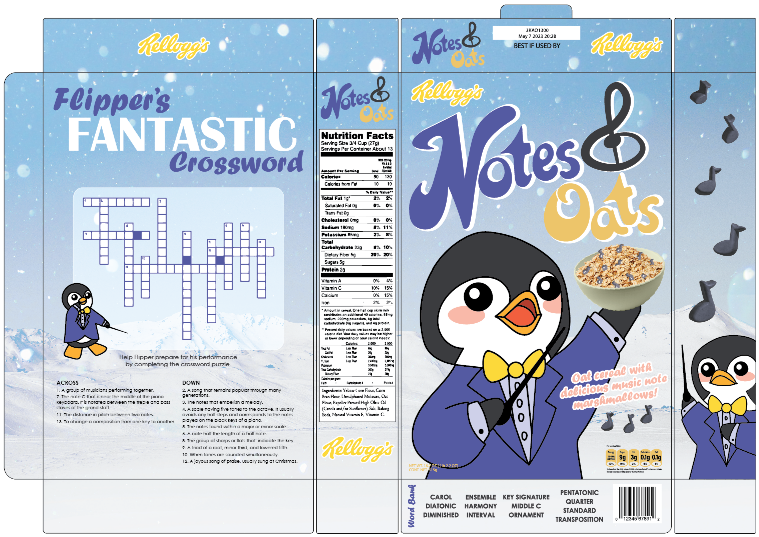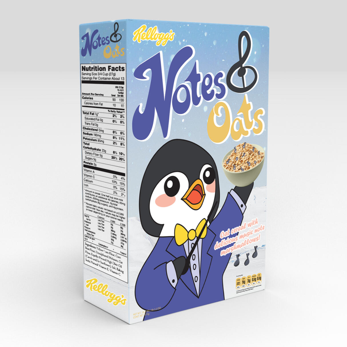 Overview: Product design is often overlooked when considering what an illustrator does for work. Cereal mascots are some of the most-recognizable brands on grocery store shelves—and someone had to draw them on each and every box.Brief: Students were tasked with developing a cereal brand with a unique mascot character. The final box design must include a finalized logo, a brand, a mascot, elements of the cereal, a game on the back of the box, and a photographic element. Each design must thoughtfully consider target audiences and legibility at a glance.Solution: With the goal of educating children about music, Notes & Oats is a fun way for children to engage with their morning meal by teaching about music terms and concepts via crosswords and other games on the back of the box. The crossword utilized here teaches basic music concepts, with a word bank at the bottom of the box for those who might not yet know all of the terms. With a mixture of photographic and drawn elements to represent the cereal, children get a good idea of what their food will taste like, while the box design retains a fun, playful element.