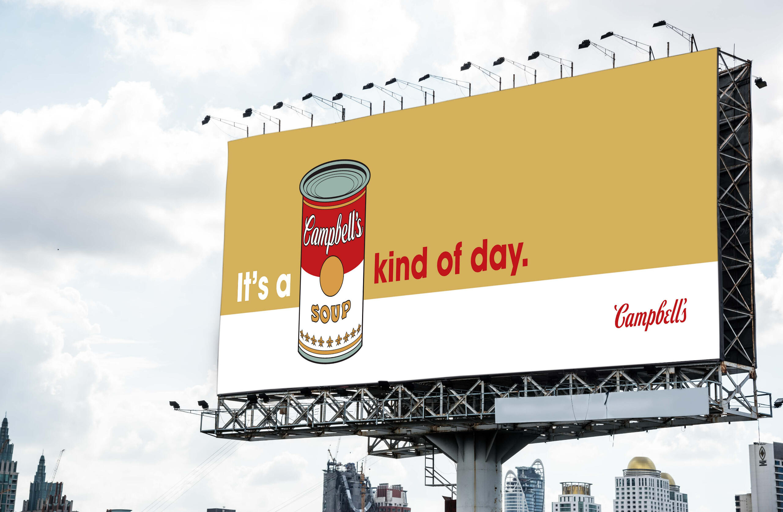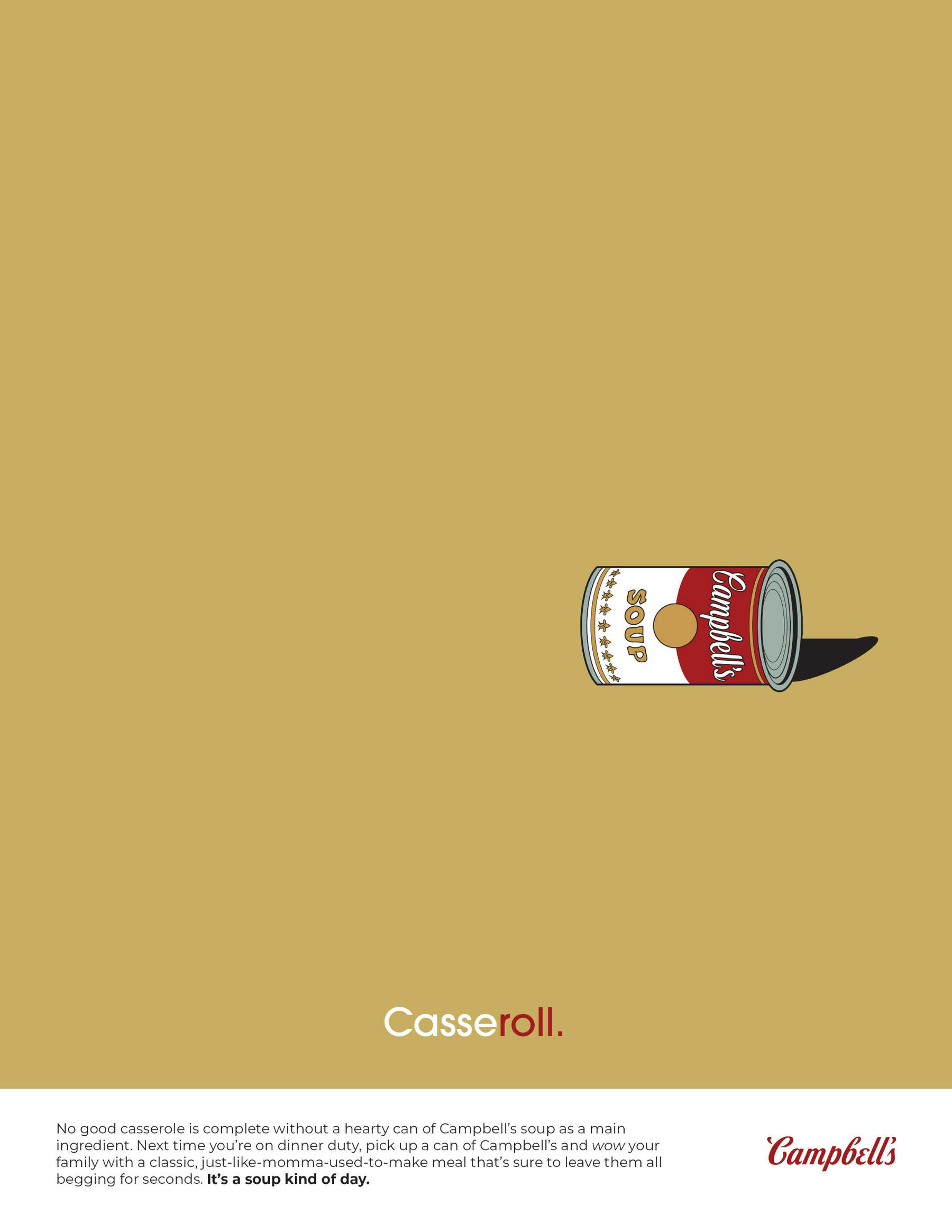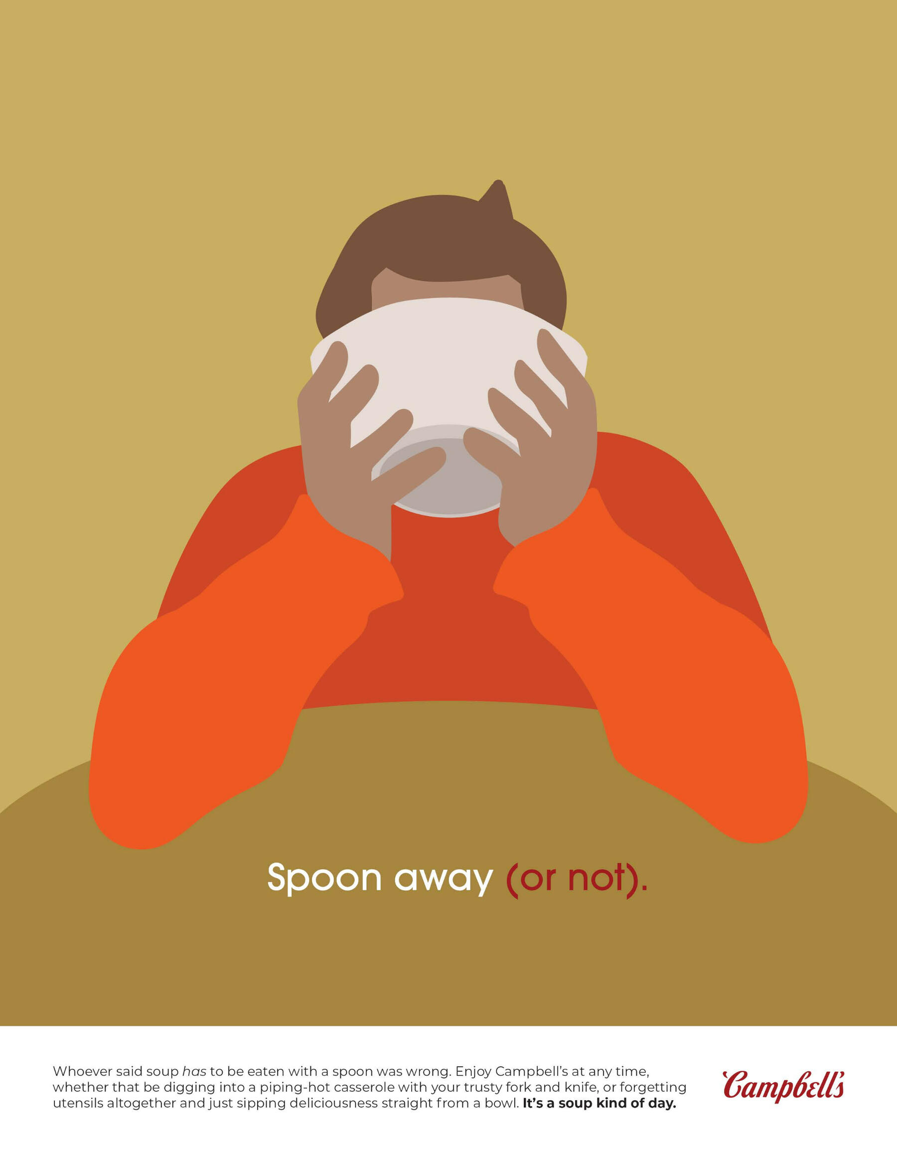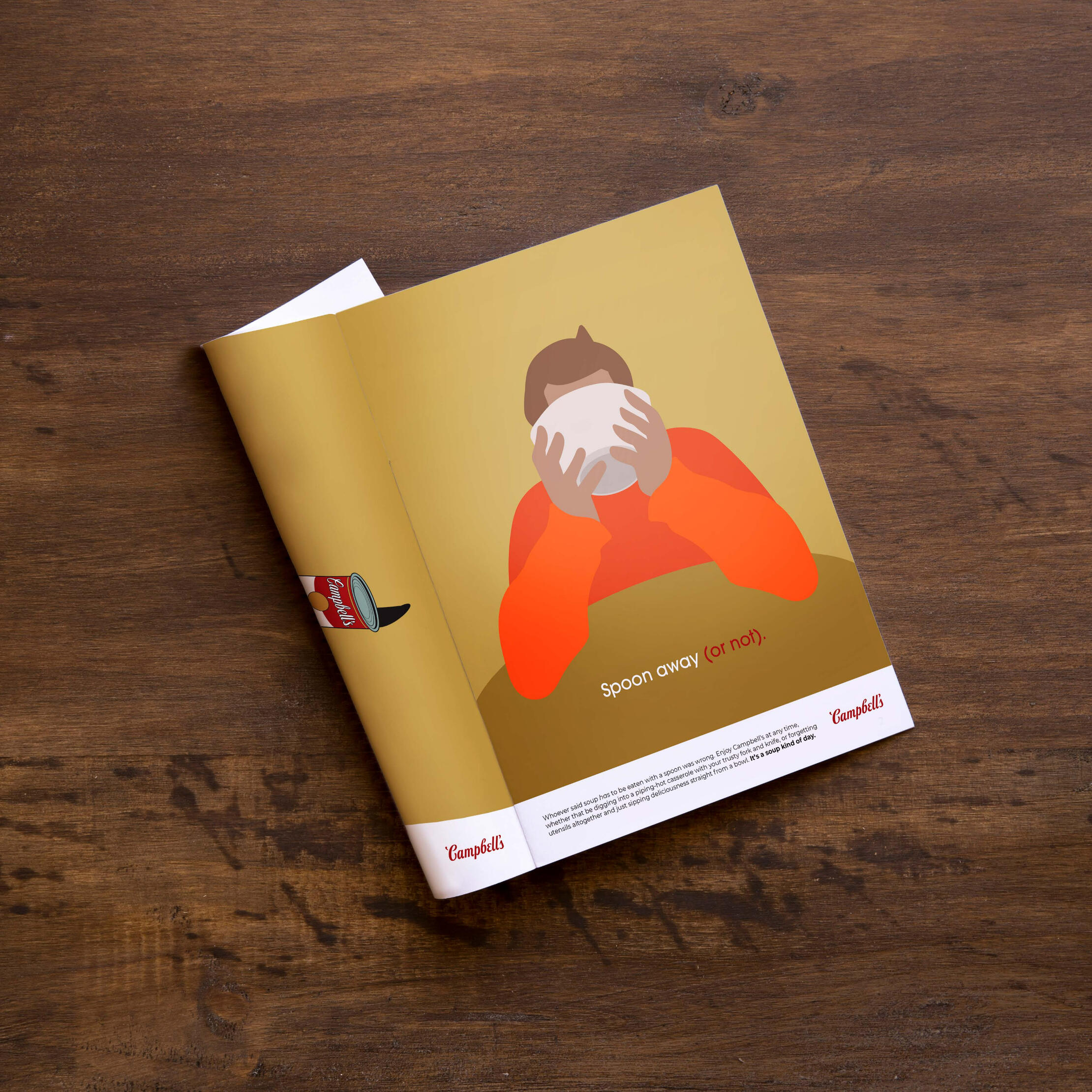 Overview: Campbell's is the king of the soup section in any grocery store, but hasn't had a truly remarkable campaign in quite some time.Brief: Write a creative brief and design a campaign with a unique slogan that includes a variety of print ads, out-of-home advertising, radio and television commercials, and social media campaigns.Solution: Aiming for a target audience of college-aged individuals who only think of soup as a side dish instead of a whole meal, the slogan "It's a Soup Kind of Day" reminds viewers that they can enjoy soup at any time, anywhere, for any reason.