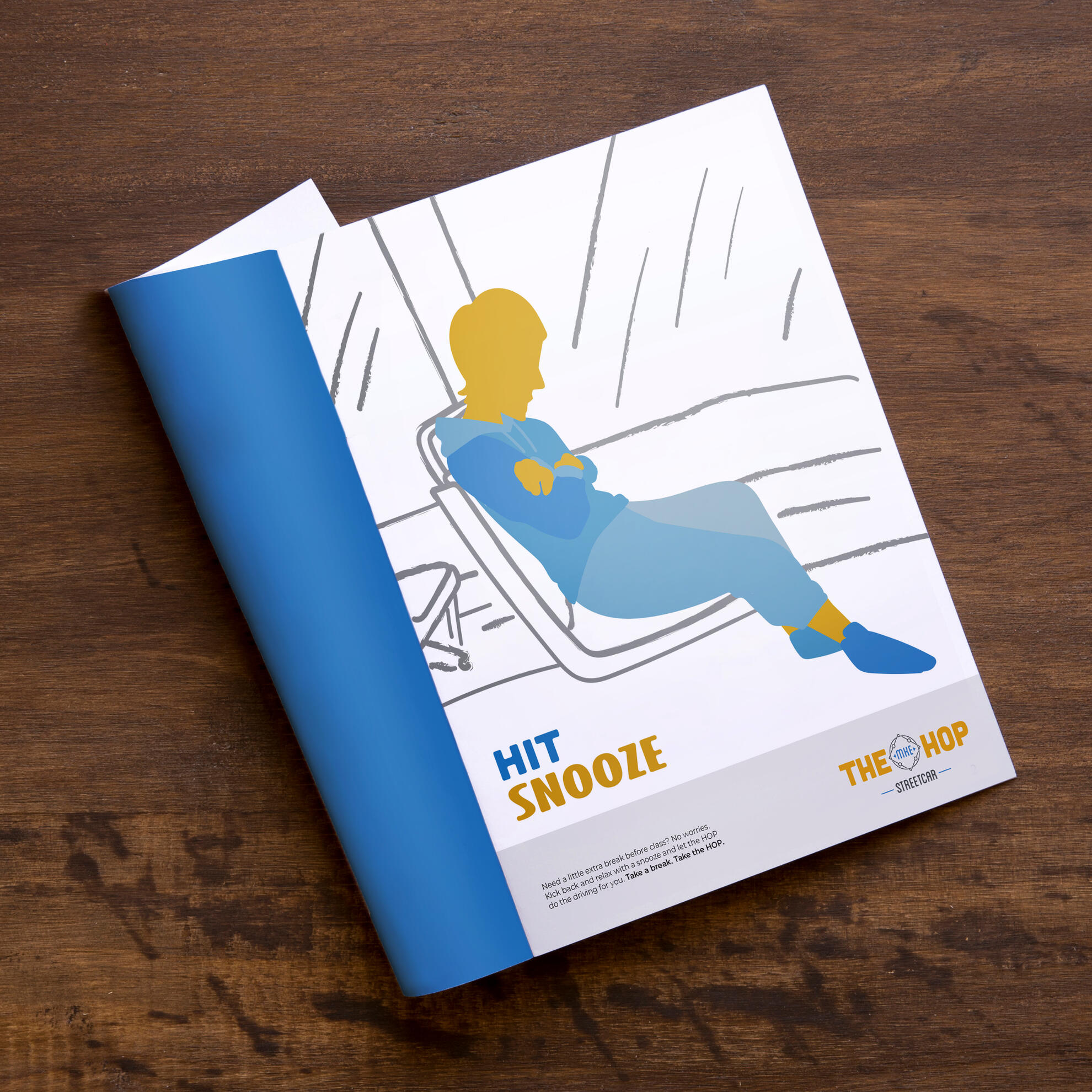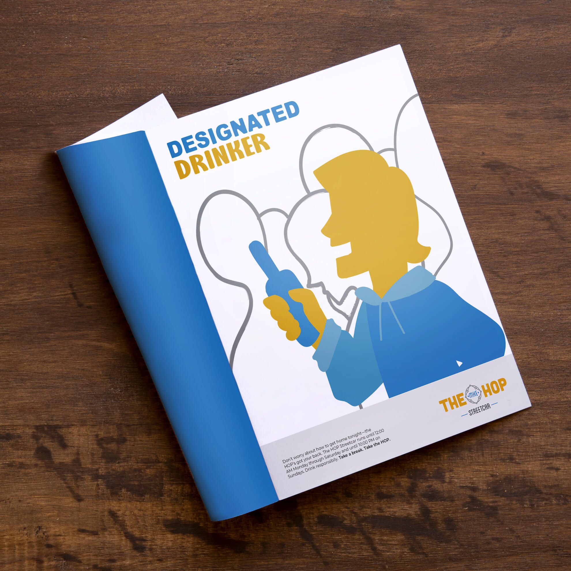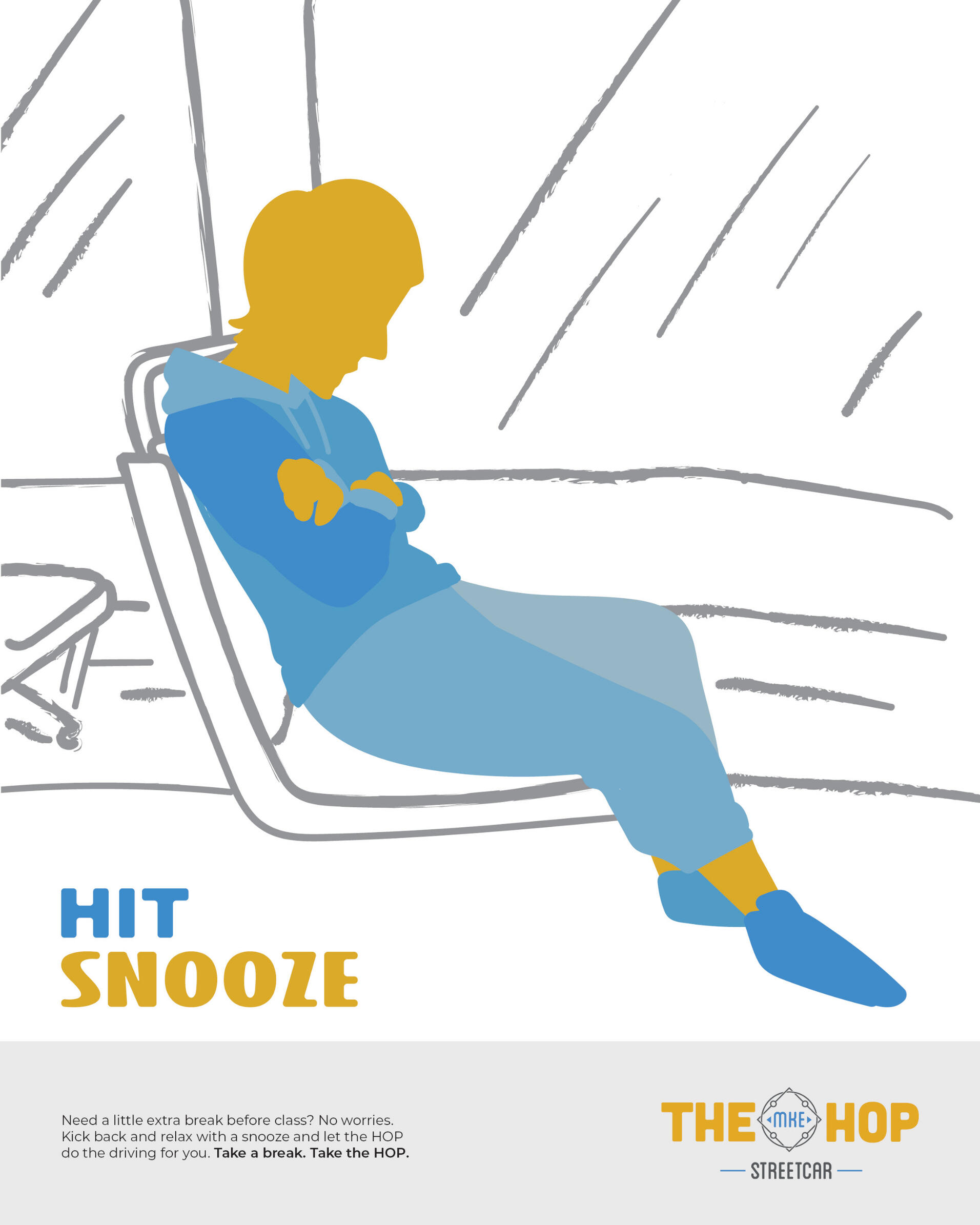 Overview: The HOP is a public streetcar that connects the Lower East Side of Milwaukee to the Historic Third Ward. It travels from the Intermodal Station to Burns Commons, making eight stops in-between, and has plans to open a new line, the “Lakefront Branch,” in late 2022. The HOP is free to ride thanks to its Potawatomi Hotel & Casino sponsorship.Brief: Students were tasked with creating a campaign that would increase ridership among a specified group of Milwaukee residents that includes three 8x10 print ads, an app icon and three mocked-up screenshots, and one execution of either guerilla or ambient advertising tactics.Solution: Through the use of a limited color palette, strong, graphic shapes, and a style hinting at street graffiti, the campaign draws the attention of a younger demographic that more often walks the streets than drives through them. By painting the street that the HOP tracks run through, it ensures that the audience knows of the HOP’s existence and remembers it next time they’re thinking about how to get home.