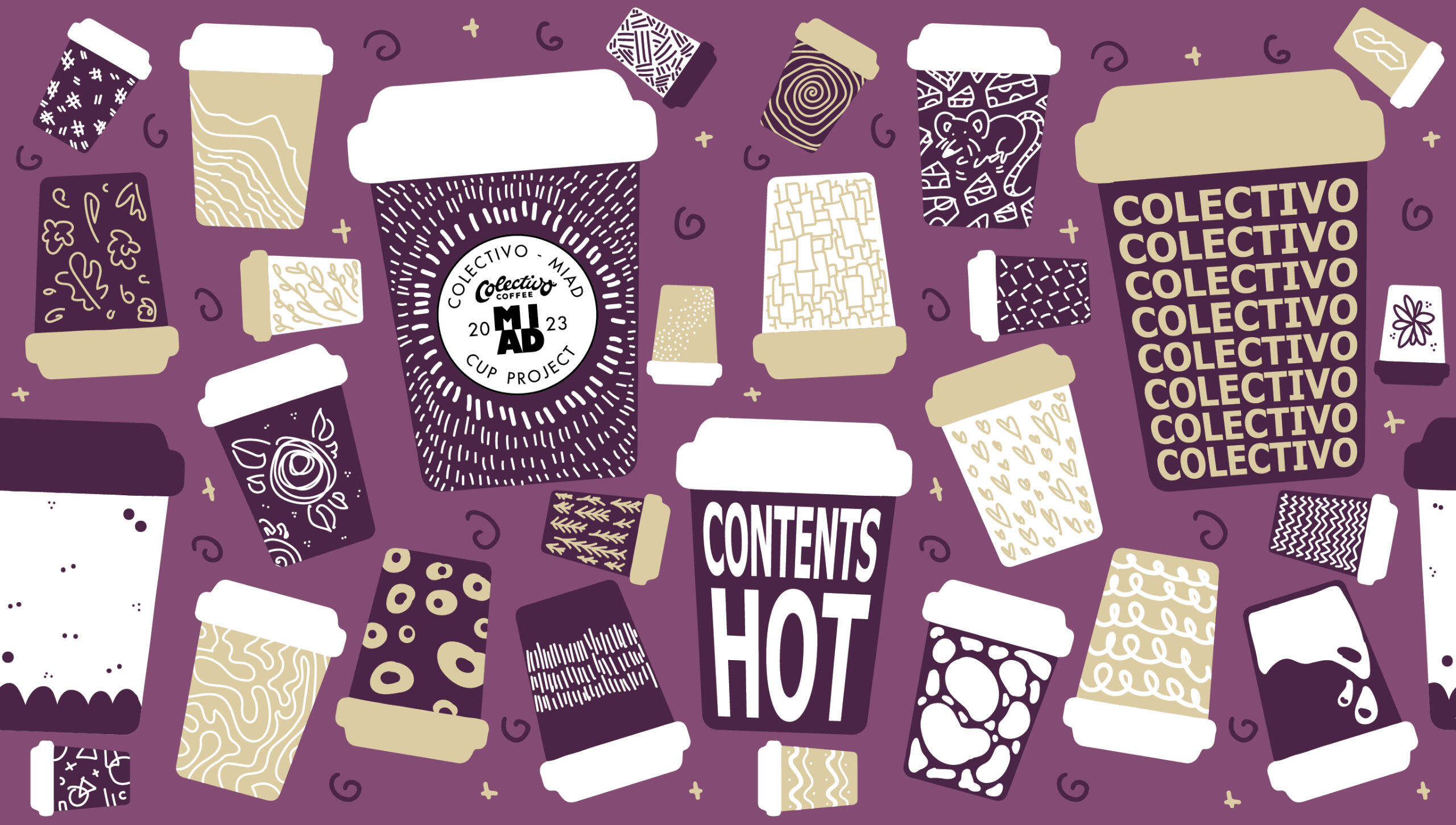 Overview: Colectivo, a coffee chain in the Milwaukee area, hosts a contest every year for senior illustrators at MIAD to design a medium-sized cup to be used in their shops.Brief: Students were tasked with creating two or three different cup designs using vector artwork and no more than three colors. Each design must take the cup wrap-around into consideration and include the Colectivo/MIAD collaboration logo and the phrase "contents hot" somewhere on the cup.Solution: Leaning into the idea of "graphic design vs illustration," the first cup design is based heavily in patterns and graphics to celebrate Colectivo and its coffee; the second design is far more illustrative, playing to the artist's personal style and utilizing unconventional drawing methods (in this case, a naive coloring style to represent playfulness); the third design is a combination of the two, being very graphic but still illustrative.