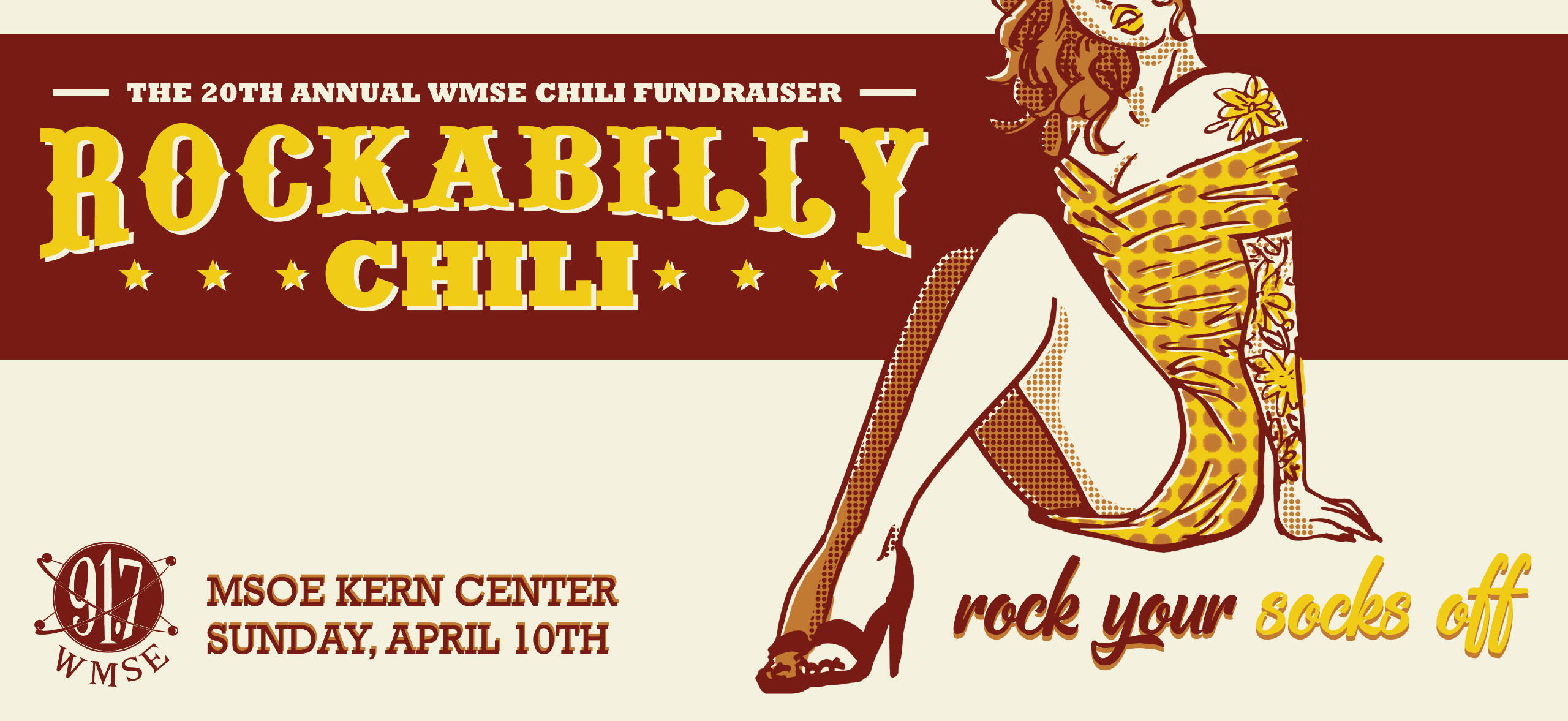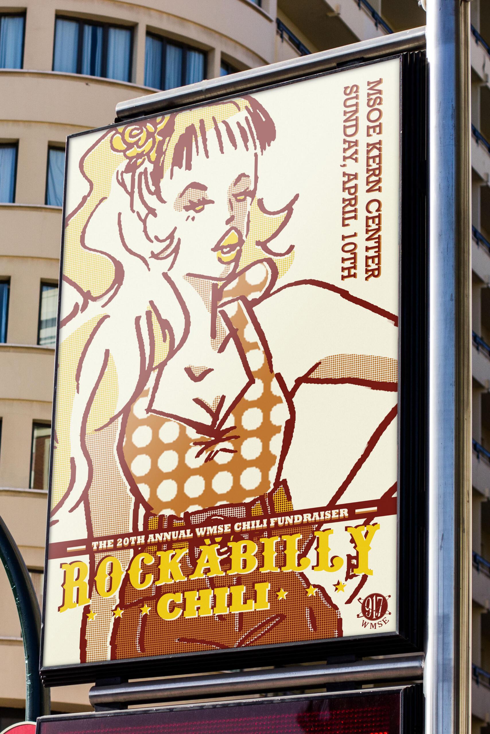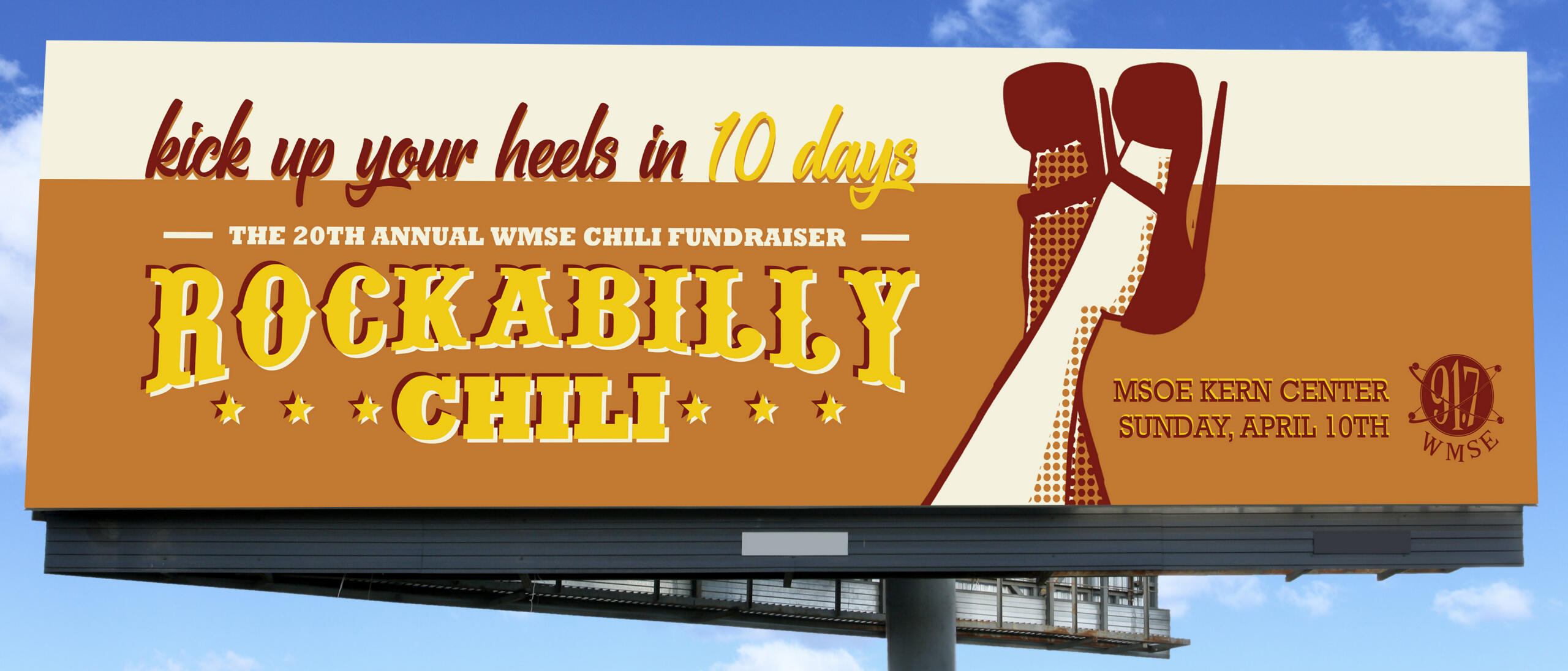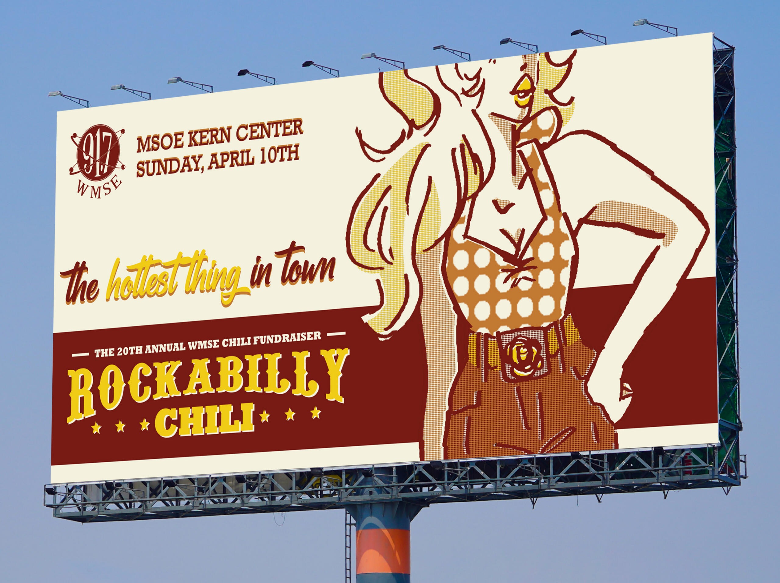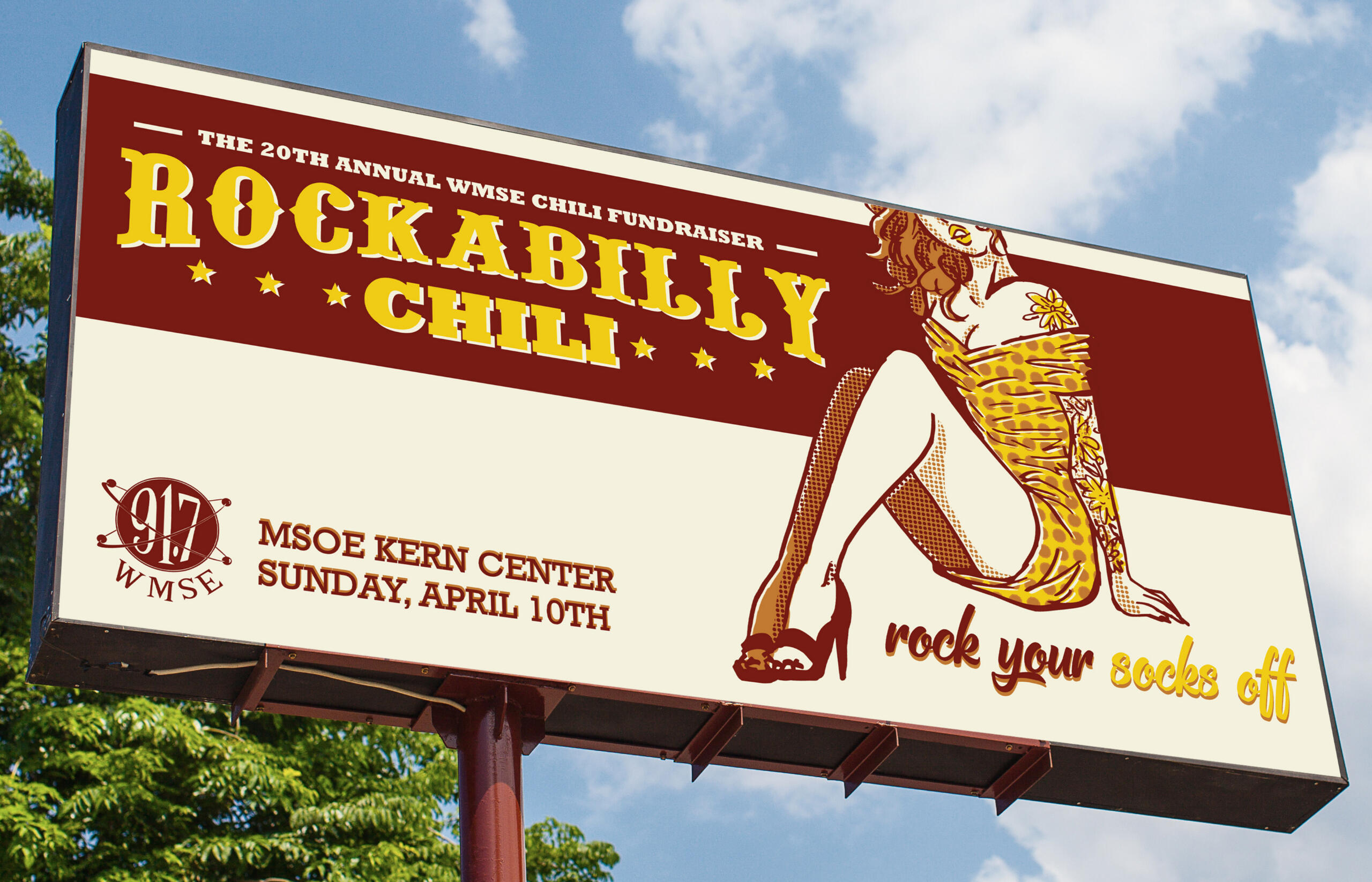 Overview: Rockabilly Chili is an annual Milwaukee-based chili fundraiser hosted by WMSE. Students were tasked with creating an advertising campaign for the event consisting of one poster, three billboard ads, three online banner ads, and one landing page design.Brief: Milwaukee residents need to be informed of the event and rock fans need to gain interest in either participating in or supporting the fundraiser.Solution: By banking on the pinup style of rockabilly fashion, advertisements will attract an audience with their fun & flirty tone and familiar sense of style.