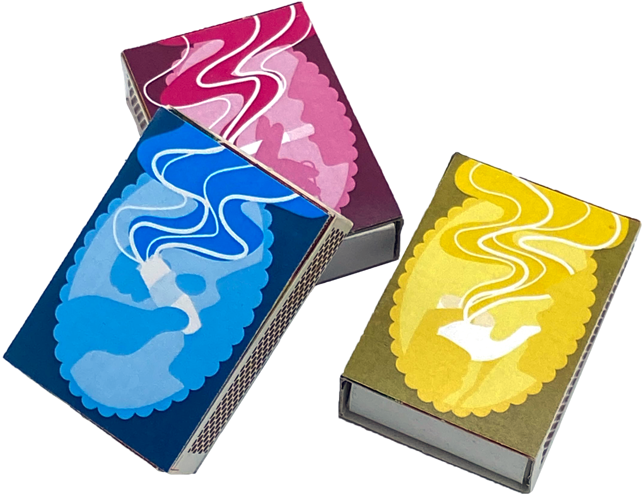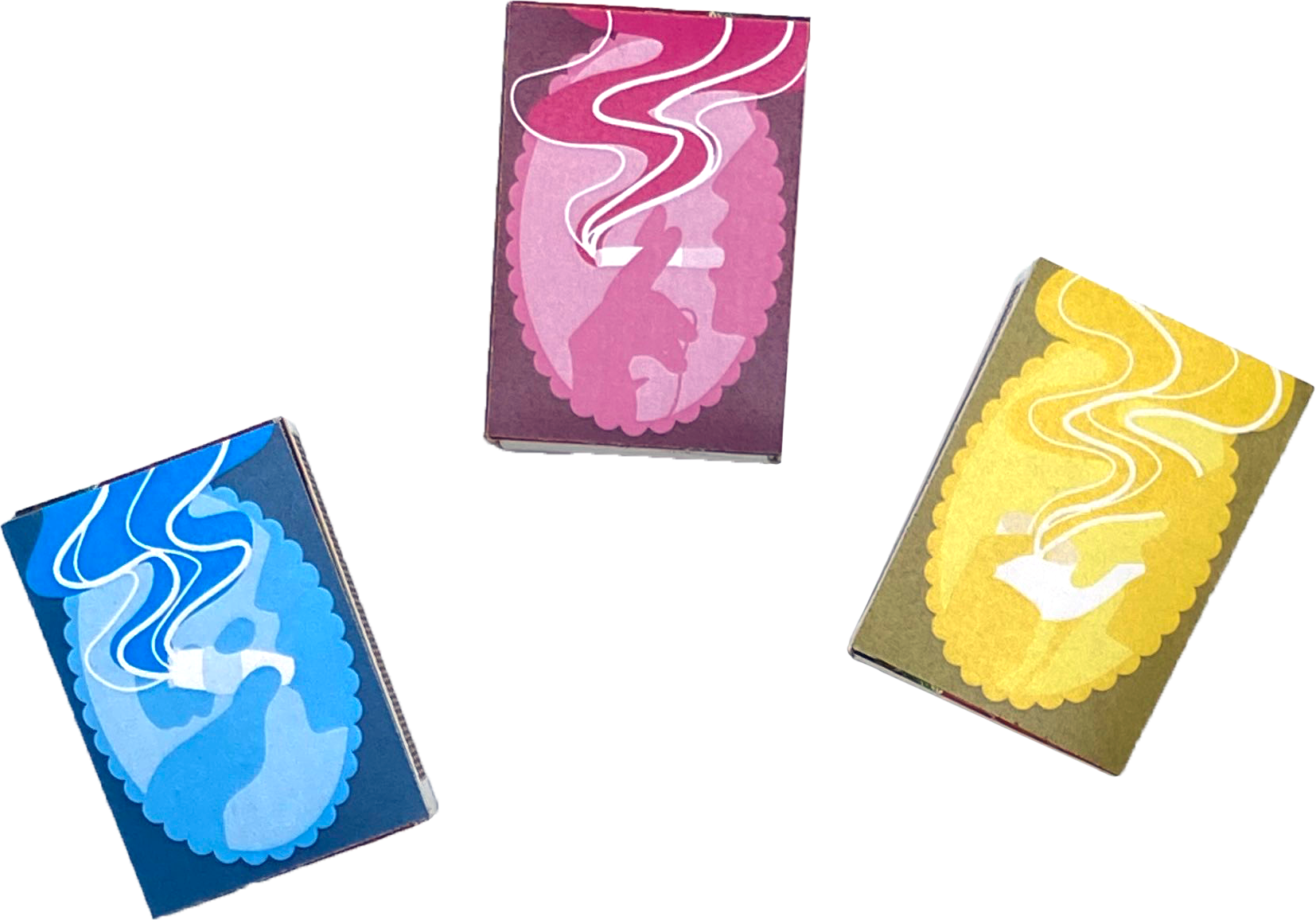 Overview: Modern matchboxes are boring and uninspired, but they used to be decorated with beautiful illustrations and typography. They were meant to be kept as display pieces and often came in sets, all similar but unique on their own.Brief: Using inspiration from old matchbox sets, create a set of three matchbox designs that can stand alone but work together in a series, all having something to do with fire.Solution: In order to put a contemporary twist on an otherwise old-timey concept, bright colors—cyan, magenta, and yellow, as in CMYK—make up profile views of three different types of smokers: cigars, cigarettes, and pipes.