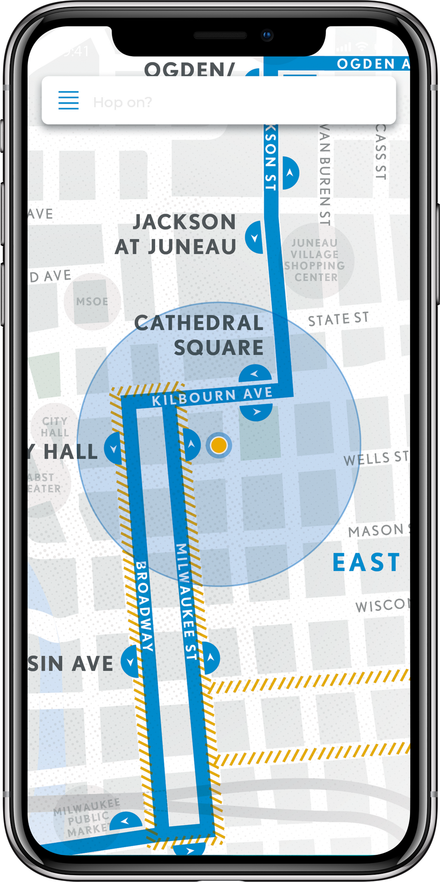 Overview: The HOP is a public streetcar that connects the Lower East Side of Milwaukee to the Historic Third Ward. It travels from the Intermodal Station to Burns Commons, making eight stops in-between, and has plans to open a new line, the “Lakefront Branch,” in late 2022. The HOP is free to ride thanks to its Potawatomi Hotel & Casino sponsorship.Brief: Students were tasked with creating a campaign that would increase ridership among a specified group of Milwaukee residents that includes three 8x10 print ads, an app icon and three mocked-up screenshots, and one execution of either guerilla or ambient advertising tactics.Solution: Through the use of a limited color palette, strong, graphic shapes, and a style hinting at street graffiti, the campaign draws the attention of a younger demographic that more often walks the streets than drives through them. By painting the street that the HOP tracks run through, it ensures that the audience knows of the HOP’s existence and remembers it next time they’re thinking about how to get home.