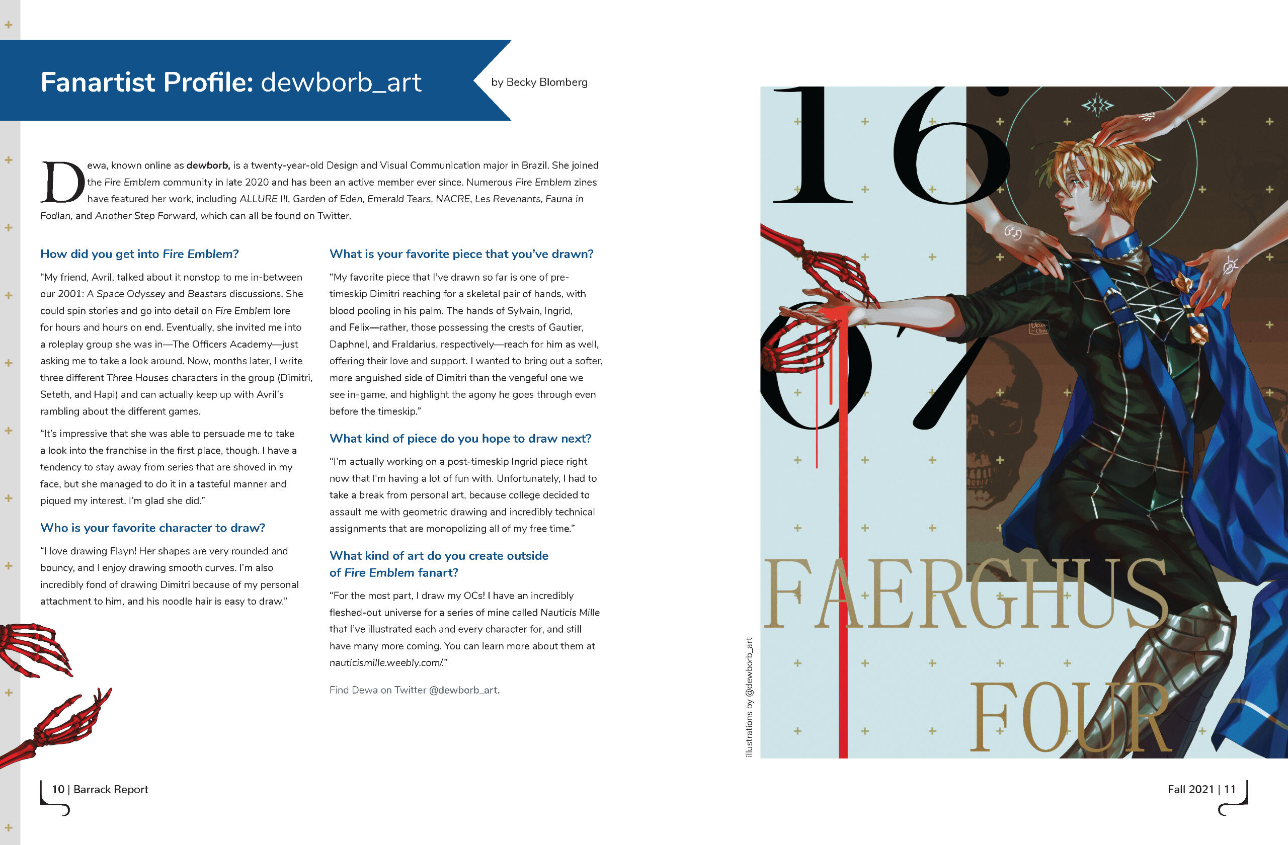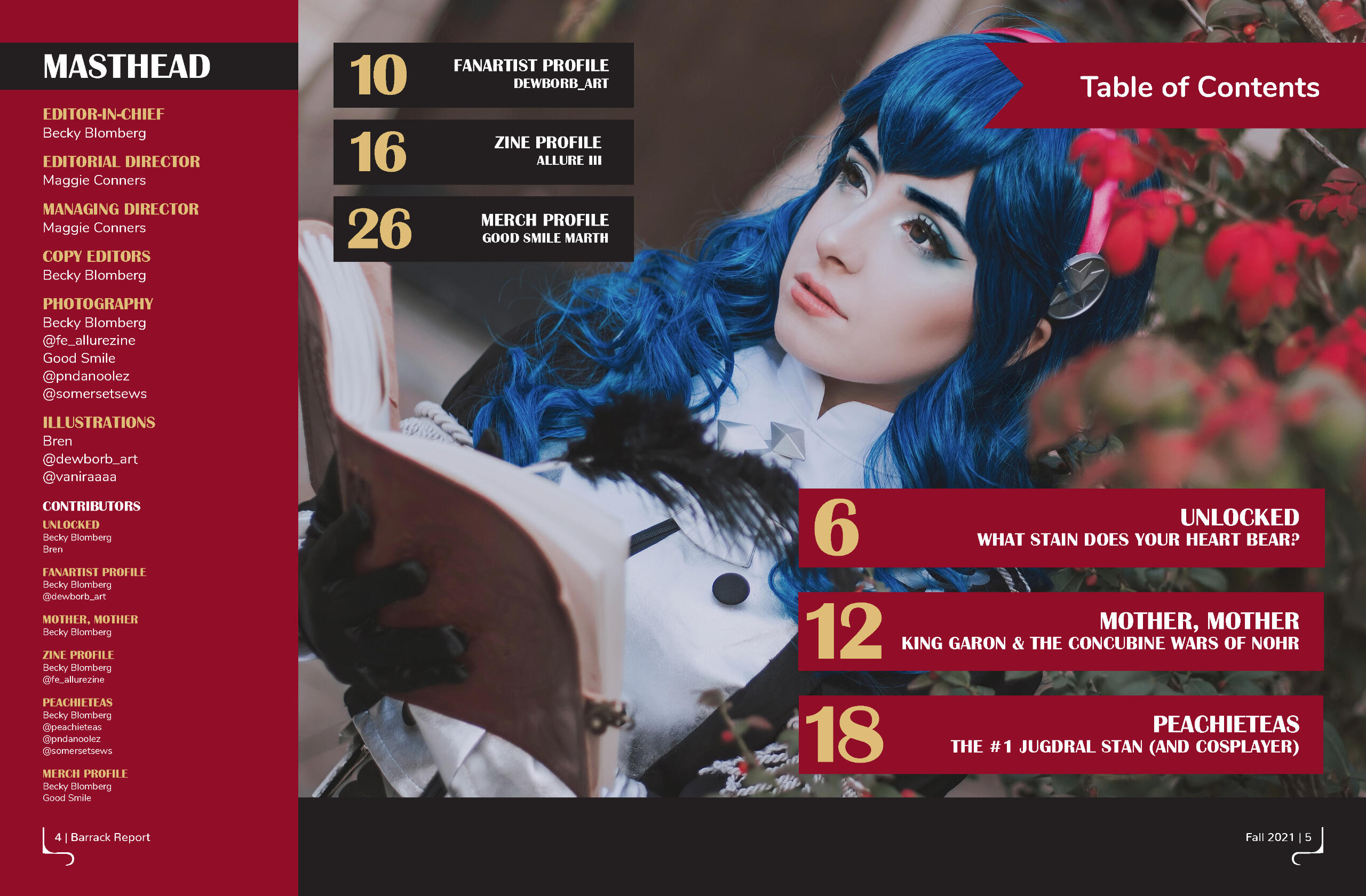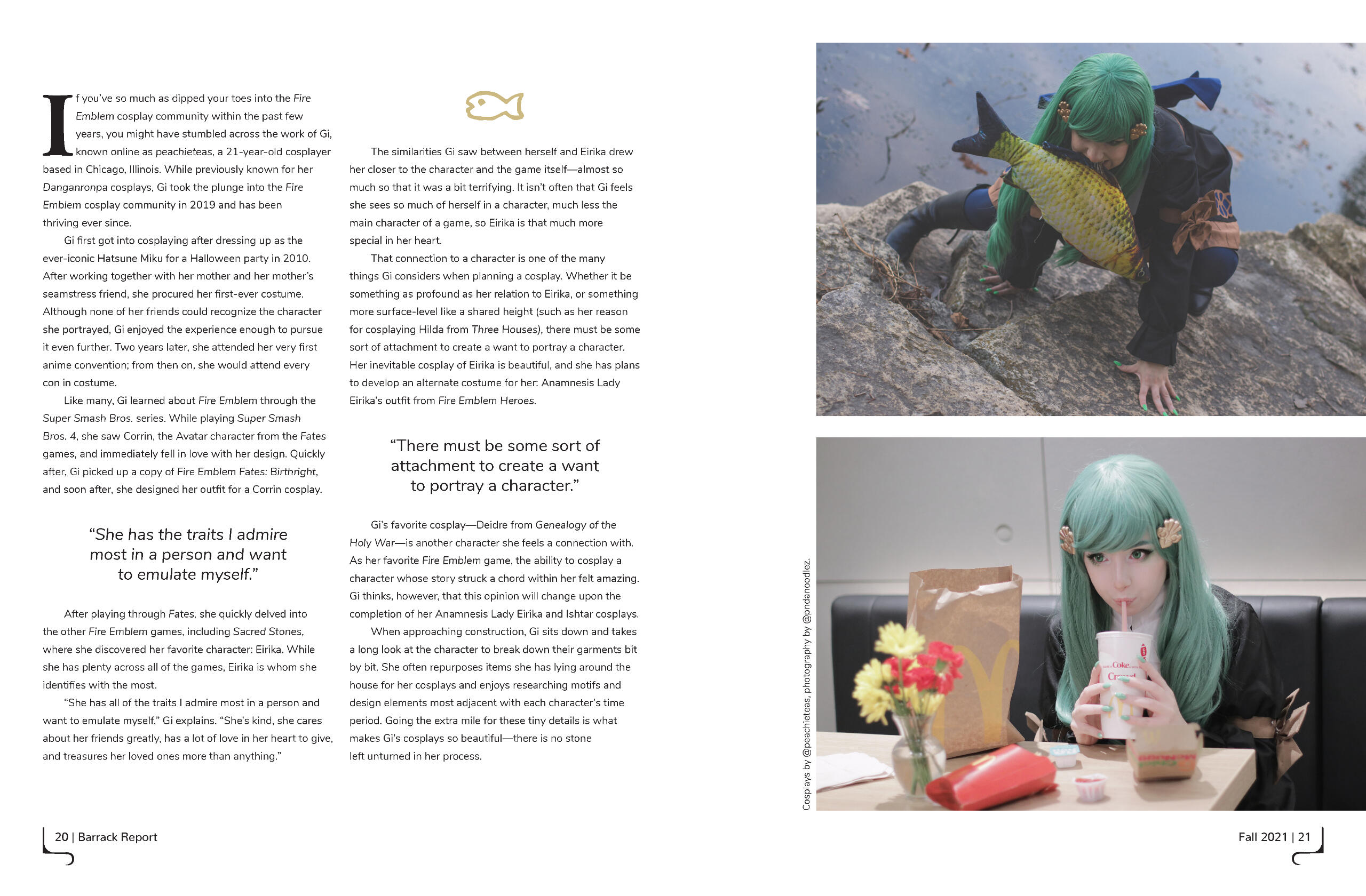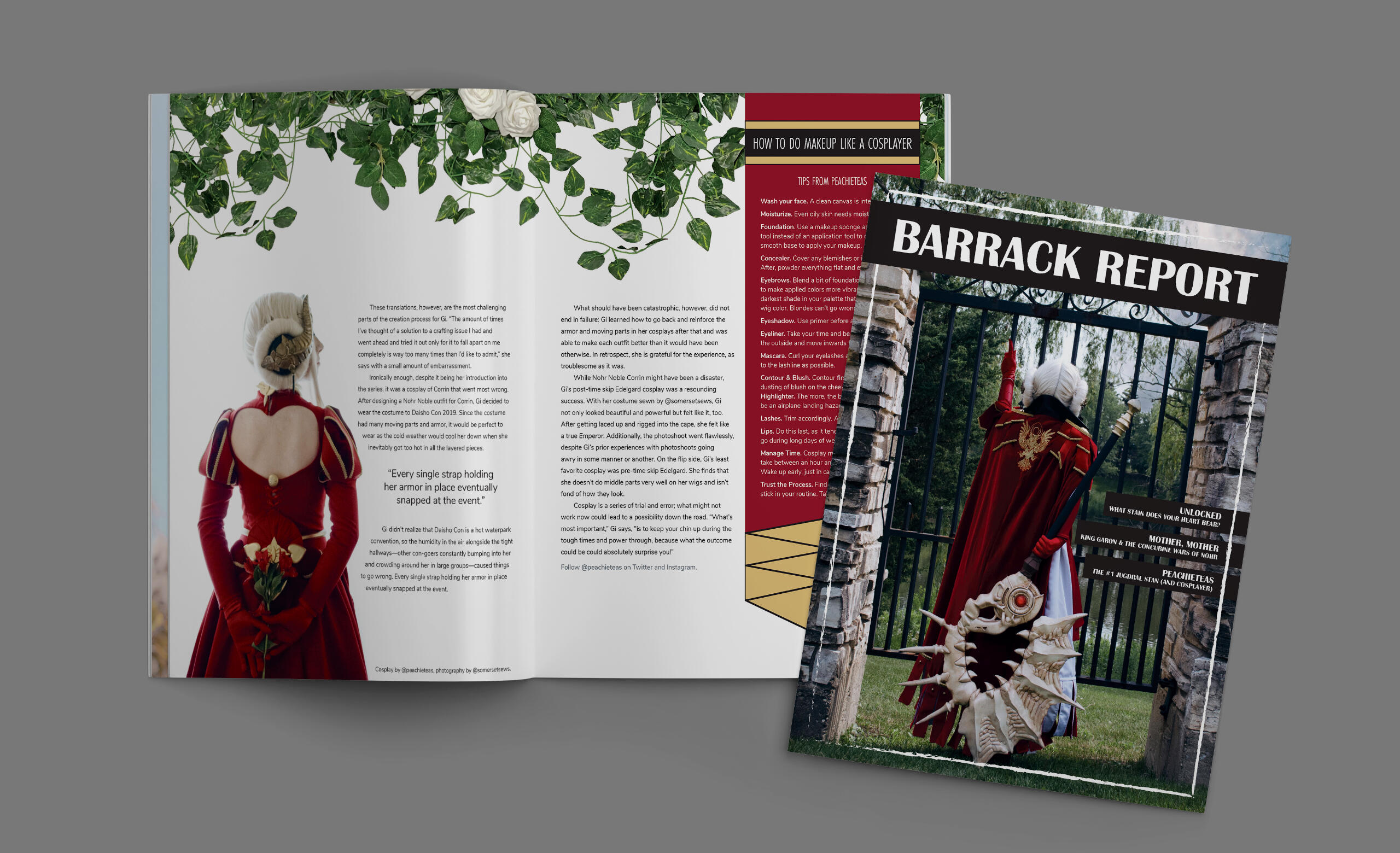 Overview: Fire Emblem is a popular videogame series by Nintendo and Intelligent Systems, with enough games, merchandise, and community members to span more than just one publication.Brief: Students were given the entirety of one semester to plan a magazine of at least 24 pages, containing 3 featured articles (focusing on illustration, typography, and photography, respectively), 3 departments, a full masthead, a table of contents, and contain at least one sidebar and infographic.Solution: By designing spreads that feature game lore and secrets, artists and groups, and cosplayers and their work, Barrack Report acts as the one-stop shop for Fire Emblem fans that want to keep up with the series and its community.
