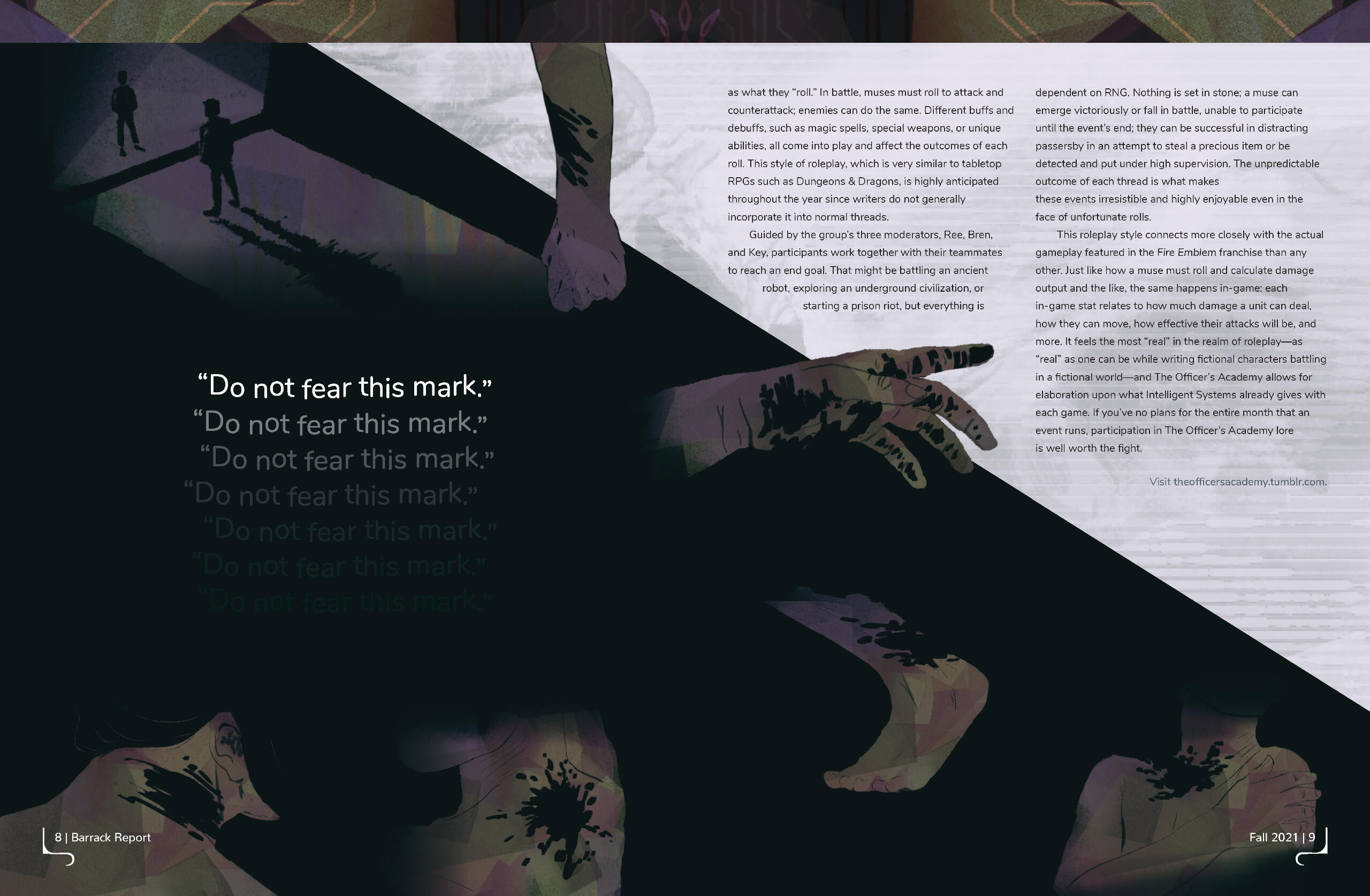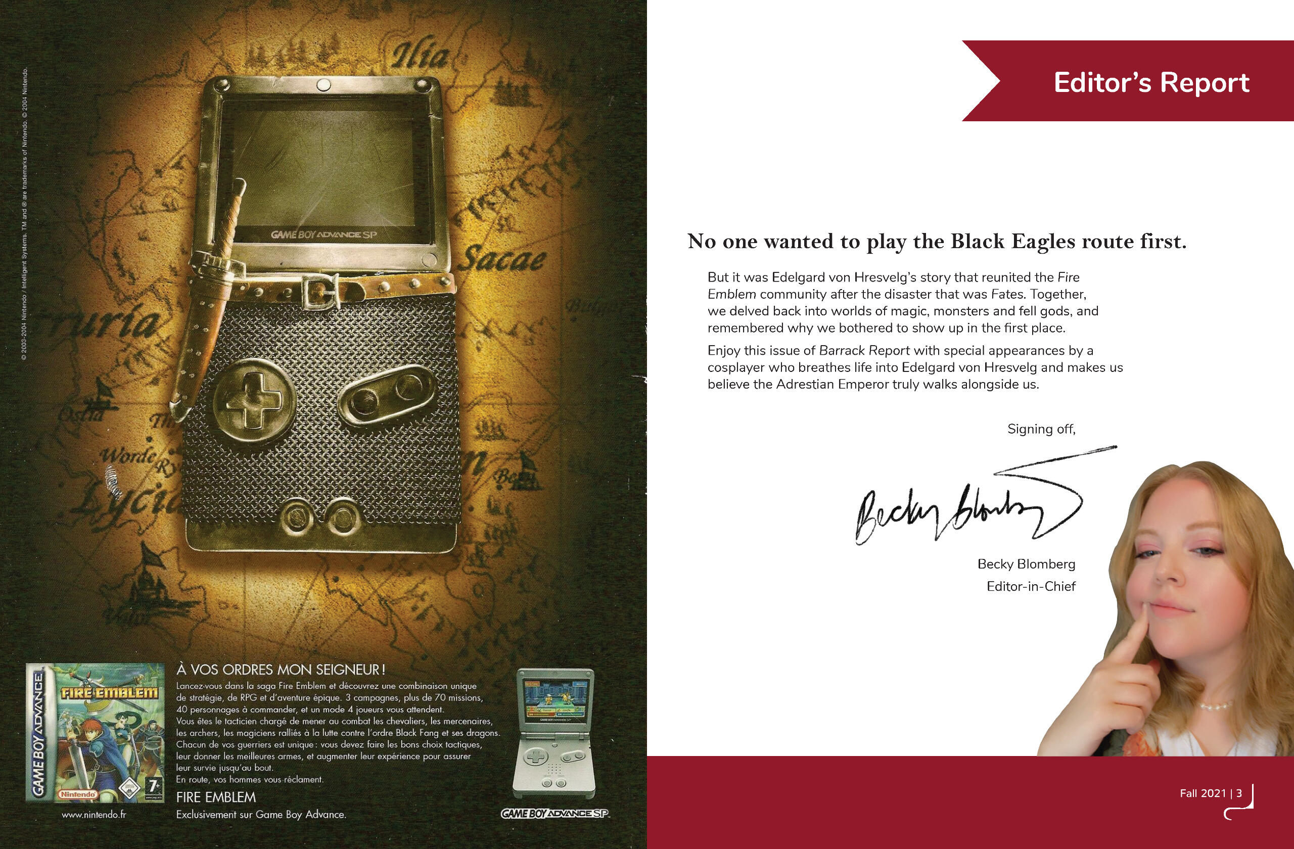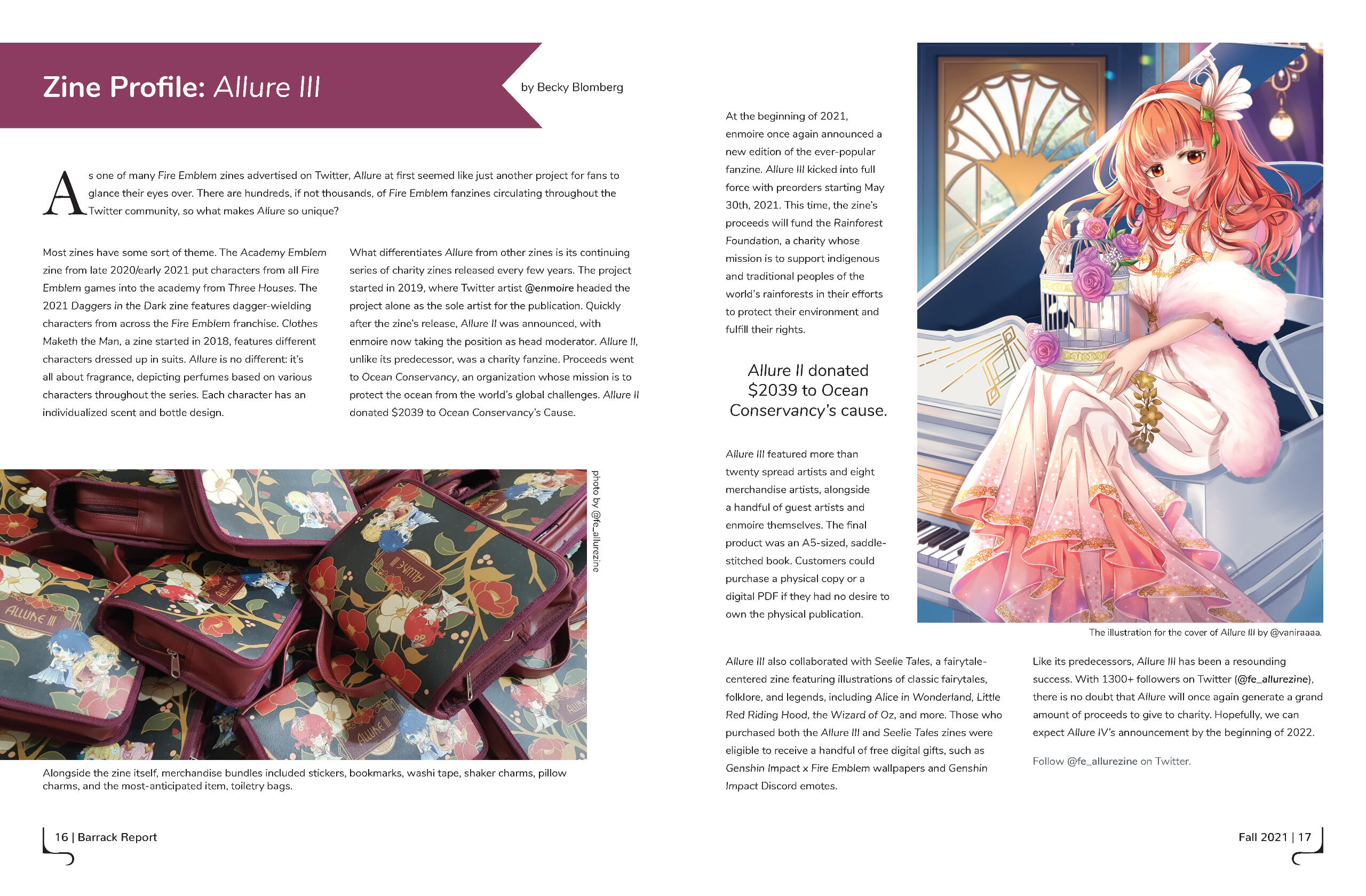 Overview: Fire Emblem is a popular videogame series by Nintendo and Intelligent Systems, with enough games, merchandise, and community members to span more than just one publication.Brief: Students were given the entirety of one semester to plan a magazine of at least 24 pages, containing 3 featured articles (focusing on illustration, typography, and photography, respectively), 3 departments, a full masthead, a table of contents, and contain at least one sidebar and infographic.Solution: By designing spreads that feature game lore and secrets, artists and groups, and cosplayers and their work, Barrack Report acts as the one-stop shop for Fire Emblem fans that want to keep up with the series and its community.