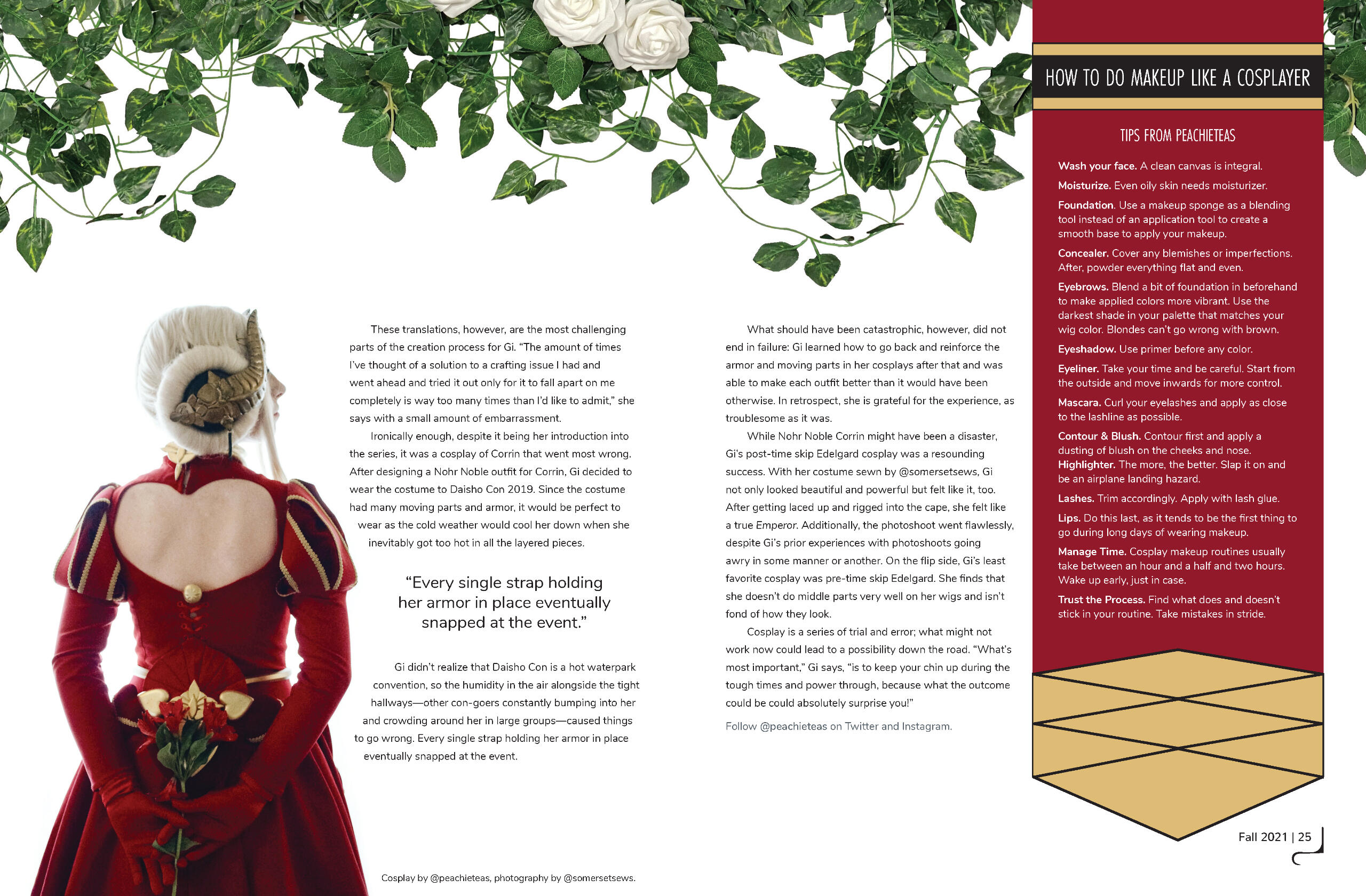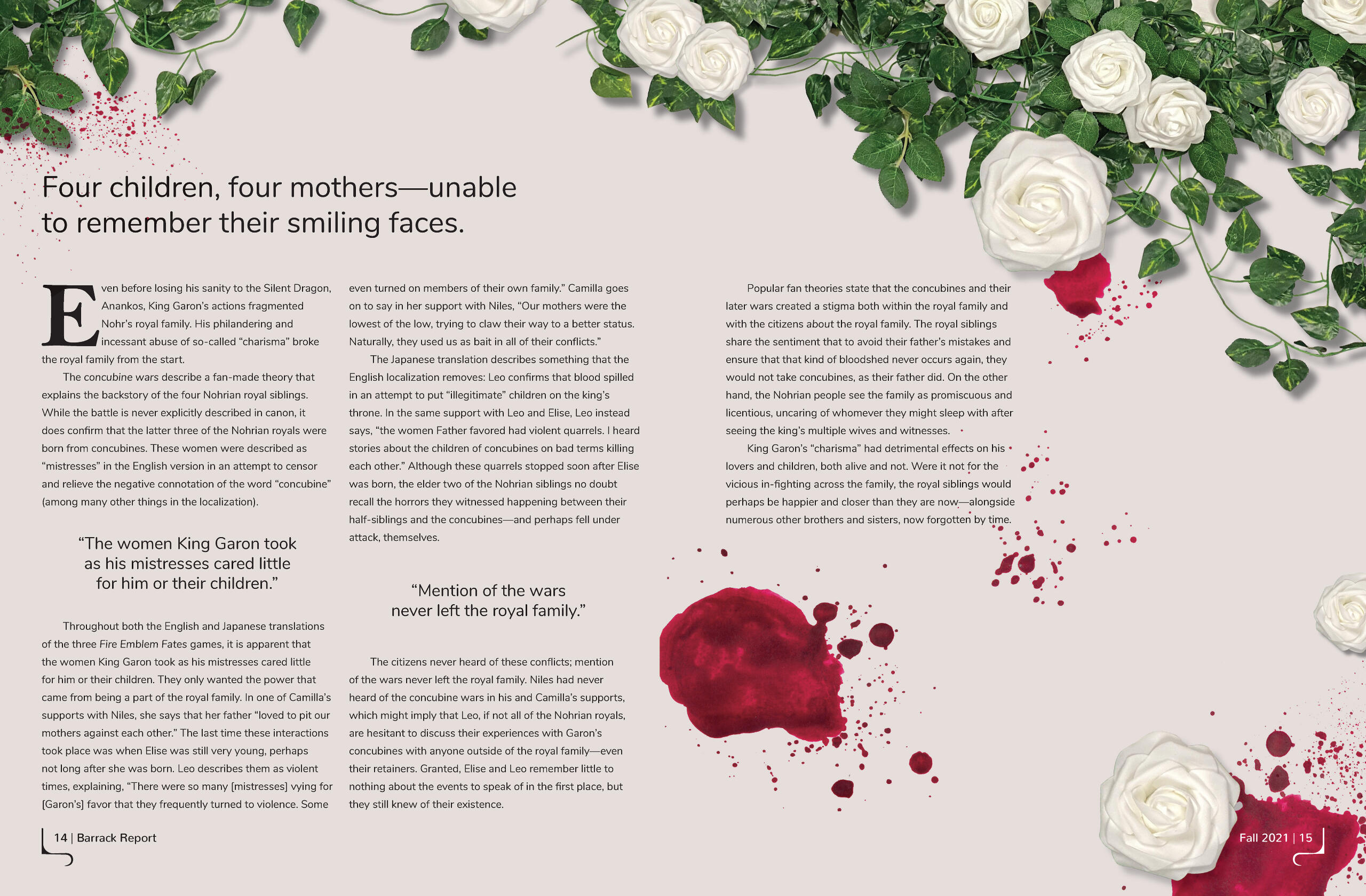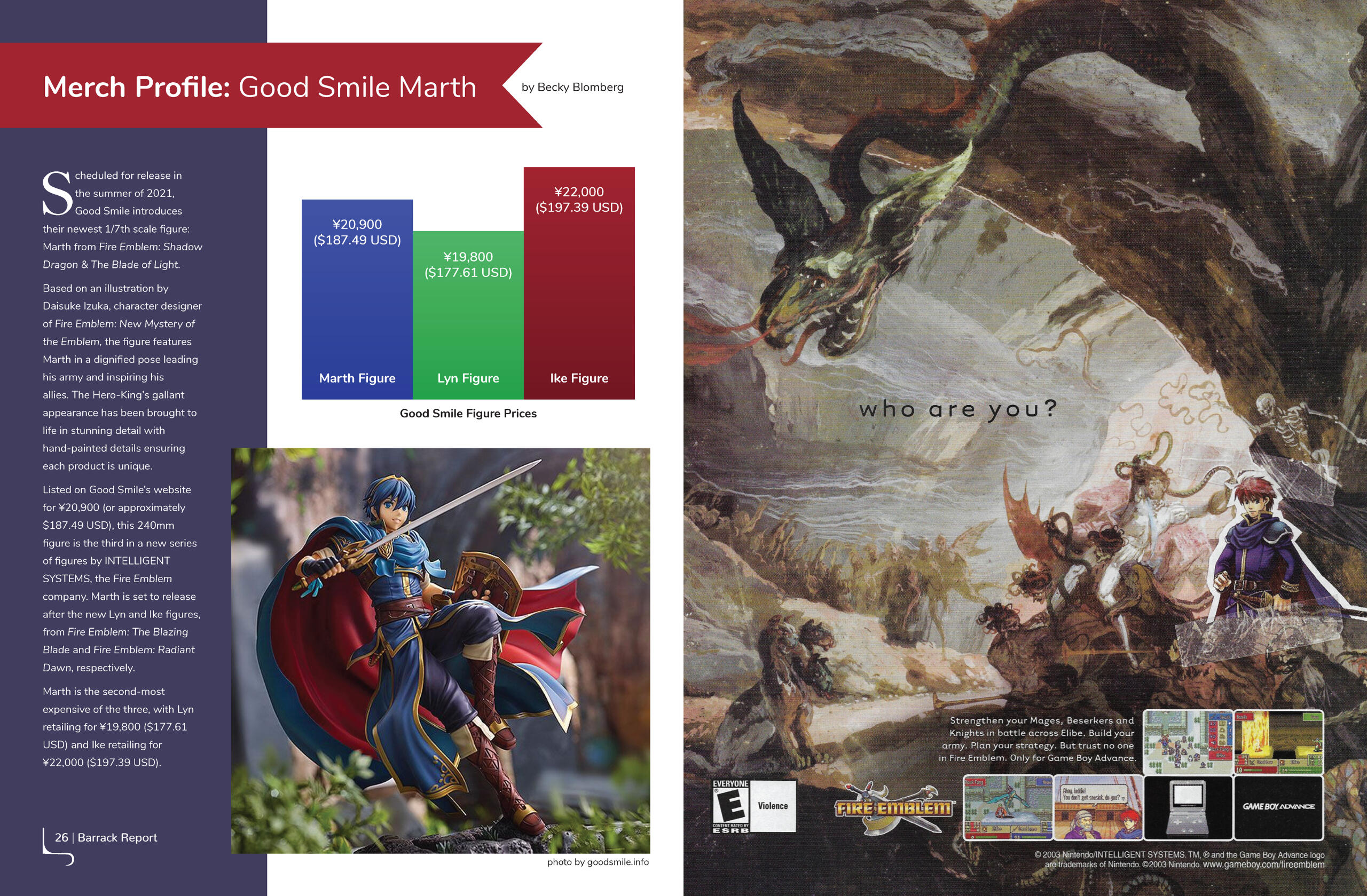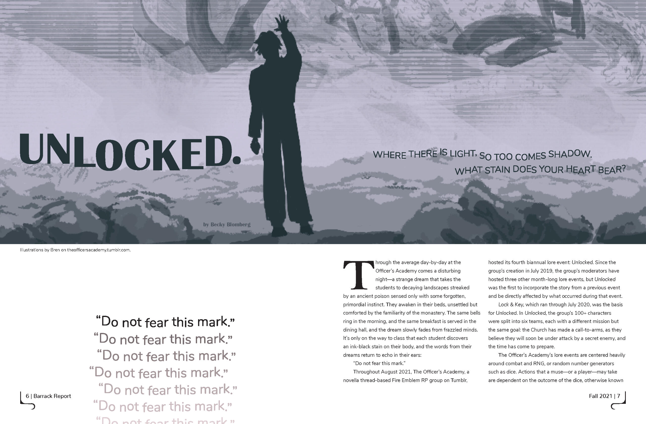 Overview: Fire Emblem is a popular videogame series by Nintendo and Intelligent Systems, with enough games, merchandise, and community members to span more than just one publication.Brief: Students were given the entirety of one semester to plan a magazine of at least 24 pages, containing 3 featured articles (focusing on illustration, typography, and photography, respectively), 3 departments, a full masthead, a table of contents, and contain at least one sidebar and infographic.Solution: By designing spreads that feature game lore and secrets, artists and groups, and cosplayers and their work, Barrack Report acts as the one-stop shop for Fire Emblem fans that want to keep up with the series and its community.