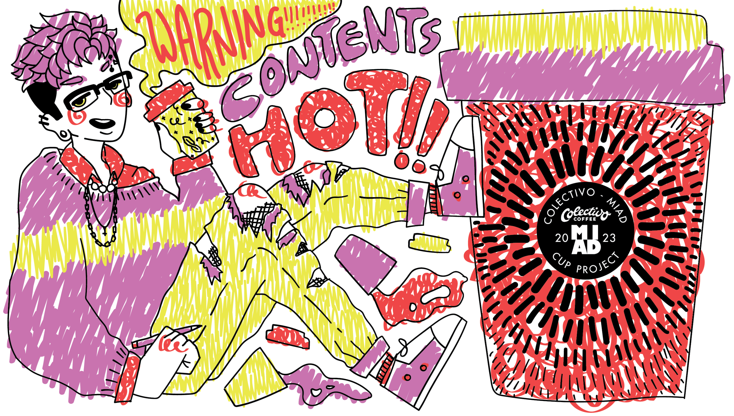 Overview: Colectivo, a coffee chain in the Milwaukee area, hosts a contest every year for senior illustrators at MIAD to design a medium-sized cup to be used in their shops.Brief: Students were tasked with creating two or three different cup designs using vector artwork and no more than three colors. Each design must take the cup wrap-around into consideration and include the Colectivo/MIAD collaboration logo and the phrase "contents hot" somewhere on the cup.Solution: Leaning into the idea of "graphic design vs illustration," the first cup design is based heavily in patterns and graphics to celebrate Colectivo and its coffee; the second design is far more illustrative, playing to the artist's personal style and utilizing unconventional drawing methods (in this case, a naive coloring style to represent playfulness); the third design is a combination of the two, being very graphic but still illustrative.
